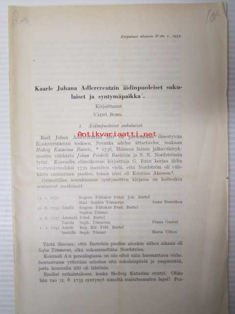 Kaarle Juhana Adlercreutzin äidinpuoleiset sukulaiset ja syntymäpaikka