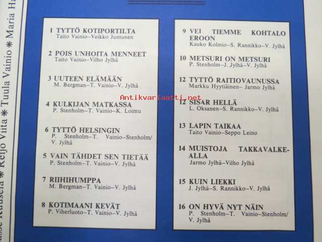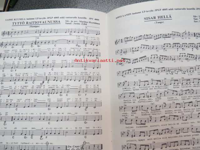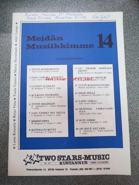 Meidän musiikkimme 14 -nuottikirja, sis. seuraavat kappaleet; Tyttö kotiportilta, Pois unhoita menneet, Uuteen elämään, Kulkijan matkassa, Tyttö Helsingin, Vain tähdet sen tietää, Riihihumppa, Kotimaani kevät, Vei tiemme kohtalo eroon, Metsuri on metsuri, Tyttö raitiovaunussa, Sisar hellä, Lapin taikaa, Muistoja takkavalkealla, Kuin liekki, On hyvä nyt näin
