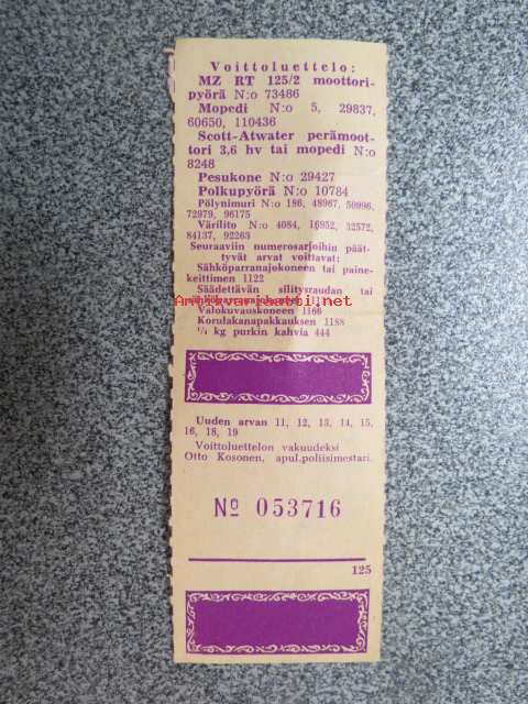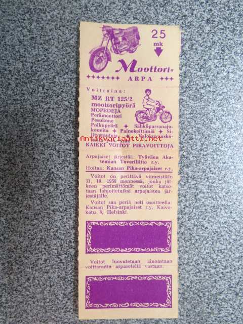 Moottoriarpa 25 mk - voittoina mm. MZ RT 125/2 -arpalippu nr 053716