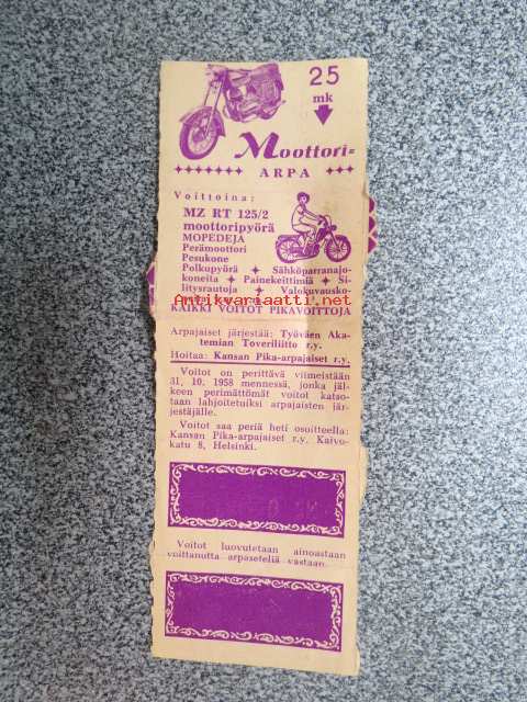 Moottoriarpa 25 mk - voittoina mm. MZ RT 125/2 -arpalippu nr 008114