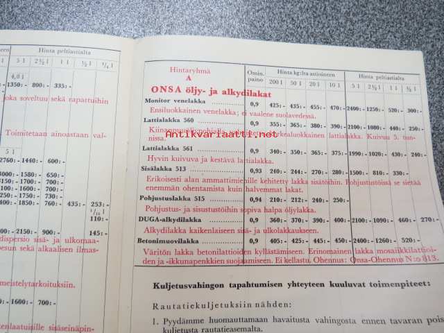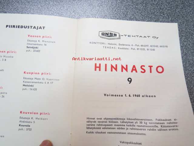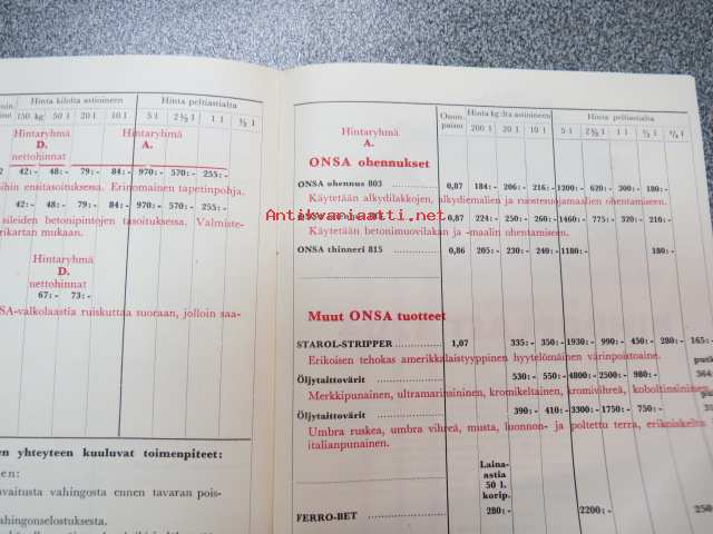 Onsa maalihinnasto 1960
