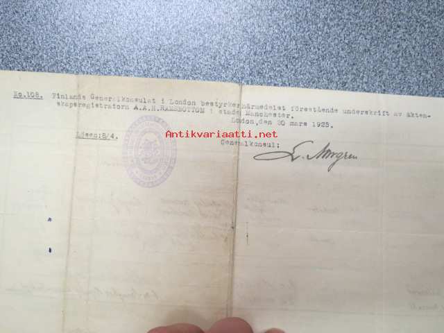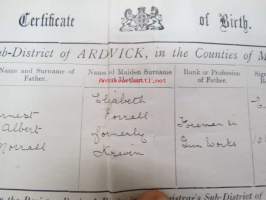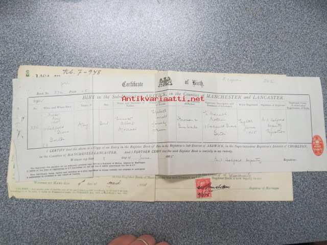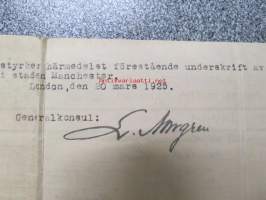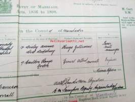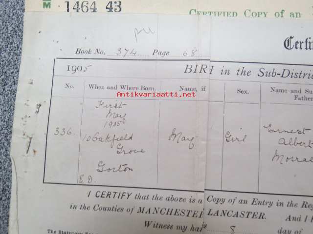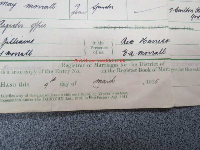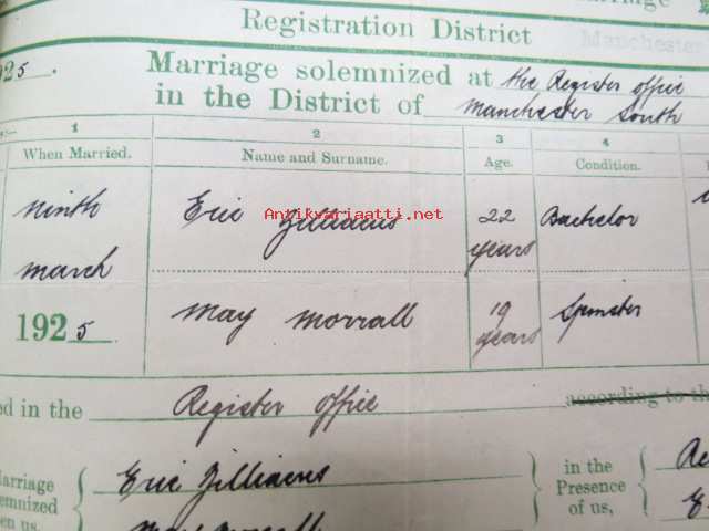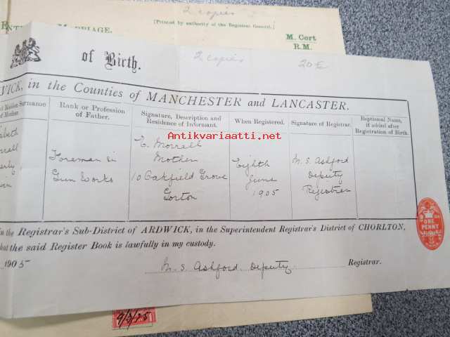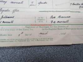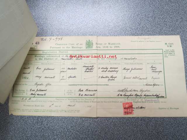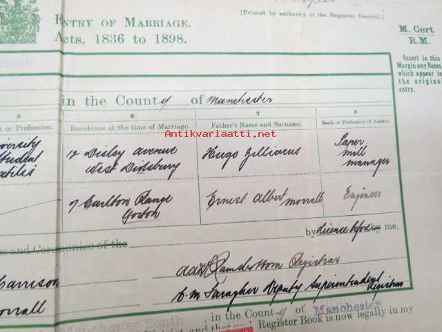 Eric Zilliacus & Mary Morrall - Certified Copy of an Entry of Marriage - Pursuant to the Marriage, Manchester south - Marriage solemnized at the Register Office...4th of March 1925 + Birth Certificate 8.6.1905 Mary Morrall -avioliittotodistus ja morsiamen syntymätodistus, avioliittotodistus todistettu oikeaksi Suomen Pääkonsulin toimistossa, Ericin isä "Paper Mill Manager", Maryn is "Engineer"