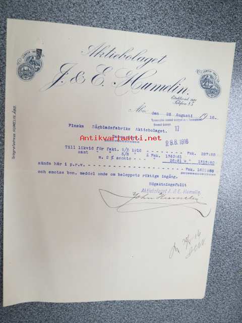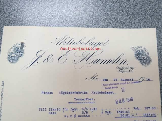 Ab J.E. Humelin, 28.8.1916 -asiakirja, huomaa venäjänkielinen sotasensuurileimaus