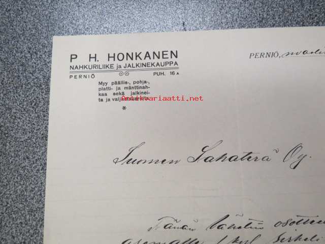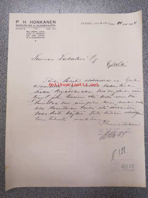 P.H. Honkanen - Nahkuriliike ja jalkinekauppa, Perniö, 20.3.1924 -asiakirja