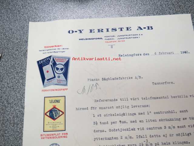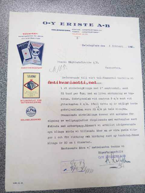 Oy Eriste Ab, Helsinki, 6.2.1943 -asiakirja