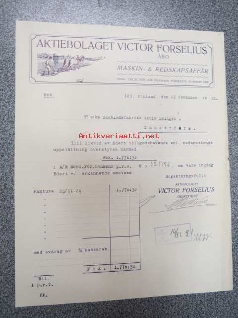 Ab Victor forselius, turku, 15.12.1921 -asiakirja