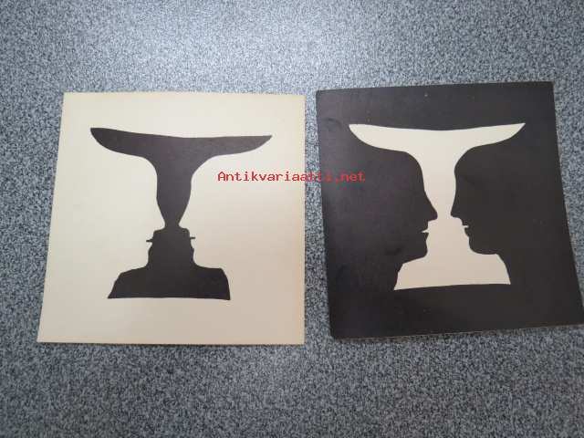 10 x 10 cm. Pari, toinen mustapohjainen ja toinen valkopohjainen.