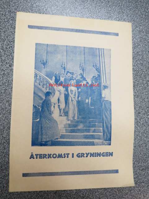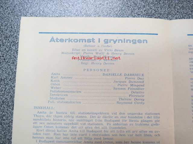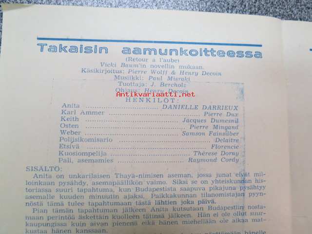 Takaisin aamunkoitteessa - Återkomst i gryningen, ohjaus Henry Decoin, pääosissa Danielle Darrieux, Pierre Dux, Jacques Dumesnil -elokuvan käsiohjelma