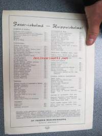 | Saatavilla | 1 kpl | | Julkaisuvuosi | 19?? | | Sivuja | 4 | | Kunto | K2 | | Sidonta/painoasu | Pienpainate | | Kielet | Suomi, Ruotsi, Englanti |