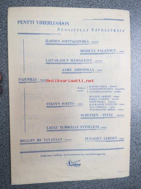 Pentti Viherluoto, Harry Etelä, Kaarlo Valkama, Soitinliike Laine, 19??21 x 30 cm.