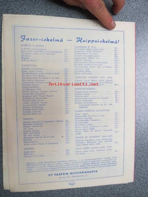 | Saatavilla | 1 kpl | | Julkaisuvuosi | 19?? | | Sivuja | 6 | | Kunto | K2 | | Sidonta/painoasu | Pienpainate | | Kielet | Suomi |