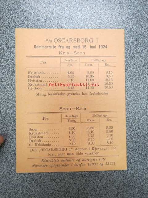 D/S "Oscarsborg I" fra og med söndag 15. Juni Kr.a-Dröbak-Hvitsten-Krokstrand-Soon -aikataulu
