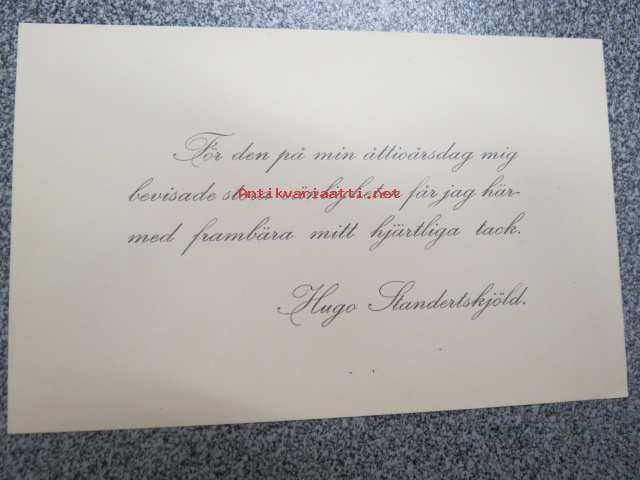 För den på min åttioårsdag mig bevisade... Hugo Standertskjöld -kiitoskortti syntymäpäivän huomioimisesta