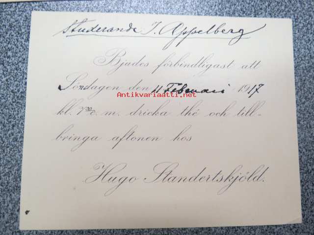 Studerande I.A. Bjudes förbindligast att Söndagen den 11.Februari 1917 kl. 1.30 e.m. dricka thé och tillbringa aftonen hos Hugo Standertskjöld -kutsukortti