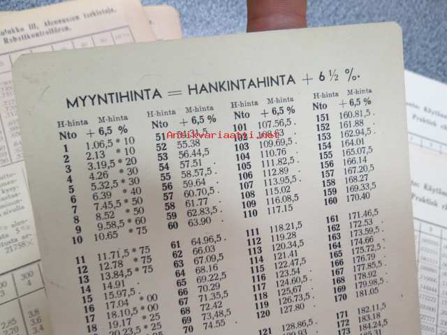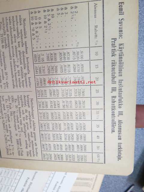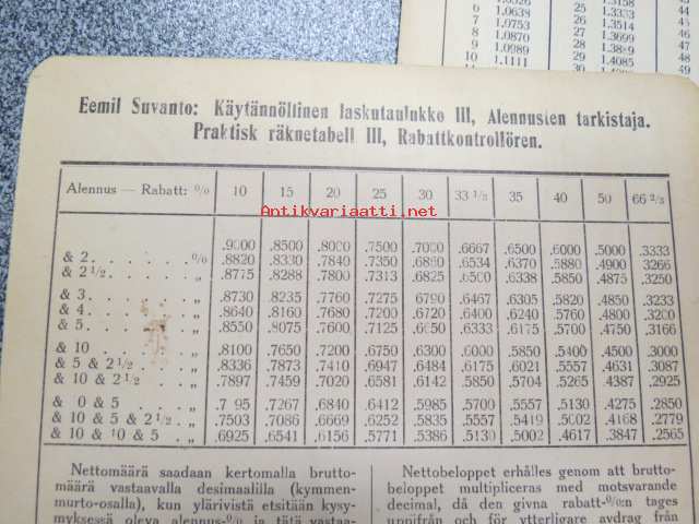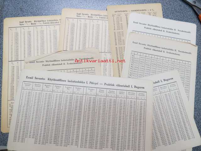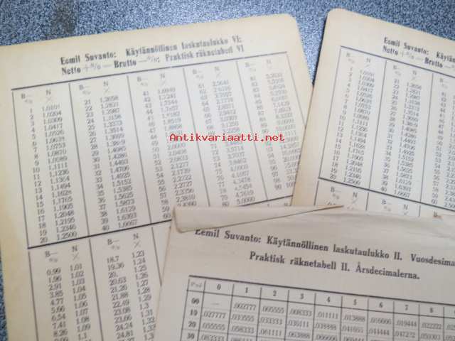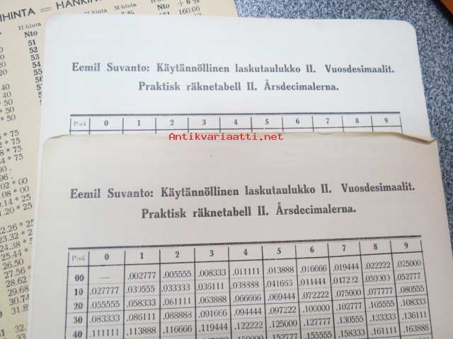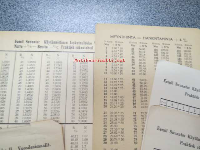 Emil SuvantoEemil Suvanto - erä erilaisia laskutaulukoita; Vuosidesimaalit, päivyri, myyntihinta = hankintahinta + 6%, alennusten tarkistaja -liiketalouteen liittyneitä, kaupankäyntiä helpottaneita taulukoita