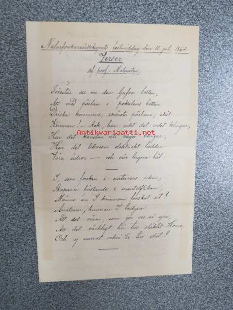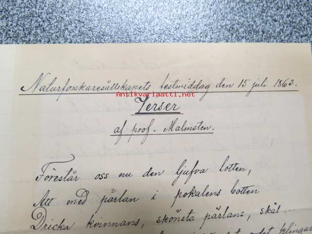 Naturforskaresällskapets festmiddag den 15. juli 1863 - Verser af prof. Malmsten -juhlatilaisuuden laulu / värssy ruotsiksi
