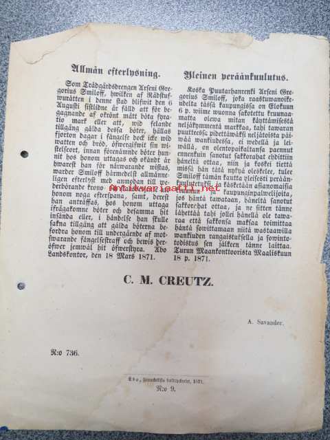 Yleinen peräänkuulutus. Koska Puutarhanrenki Arseni Gregorius Smilloff, joka... wiime wuonna sakotettu kruunaamatta olewan mitan käyttämisestä ja olentopaikaltansa paennut ennenkuin sanotut sakkorahat ehdittiin häneltä ottaa..., Turku 18.3.1871