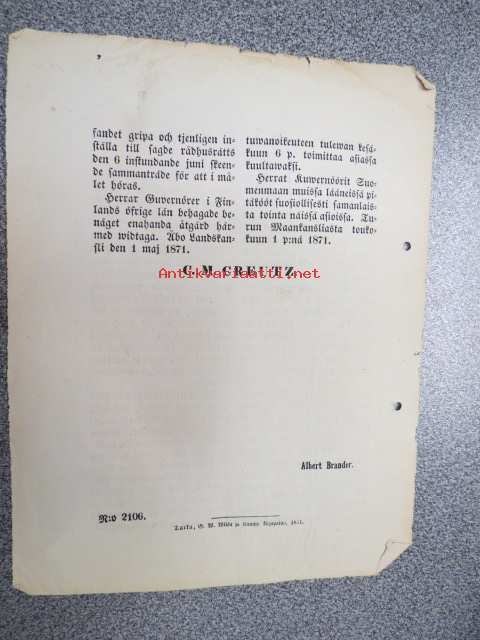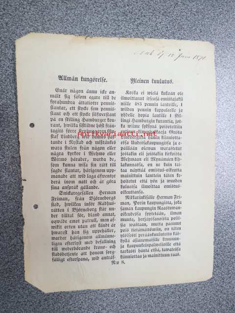 Yhteinen kuulutus. Koska ei wielä kukaan ole ilmoittautunut itsensä omistajaksi niille 483 pennin lanteille, 1 wiiden pennin kappaleelle ja yhdelle hopia lantille 1 skillinki Hamburgin kurantia, jotka wiime syksynä poisotettiin entinen kivenhakkaaja Gusta Lindbergiltä hänen kiinniottaessa Uudessakaupungissa ja epäilllään olewan warastetut jostakin eli joistakin kirkoista Wehmaan eli Mynämäen kihalkunnassa... Nikkarinkisälle Herman Friman, Porin kaupungista syytetään herjäyssanoista poliisia wastaan... 1.5.1871 -asiakirja