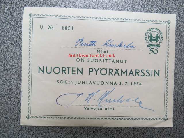 Pentti Kurkela on suorittanut Nuorten Pyörämarssin SOK:n juhlavuonna 27.6.1954 -osanottotodiste
