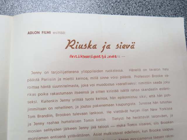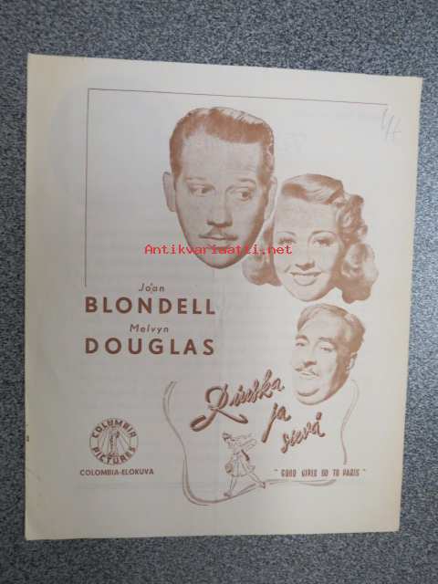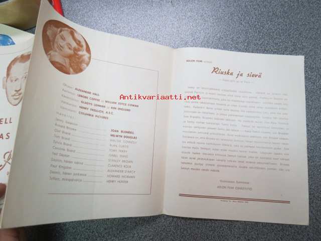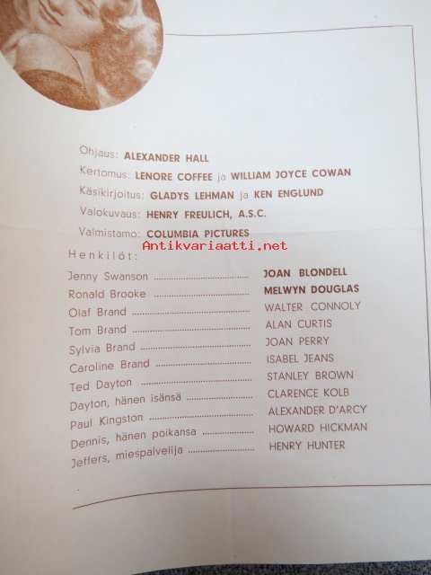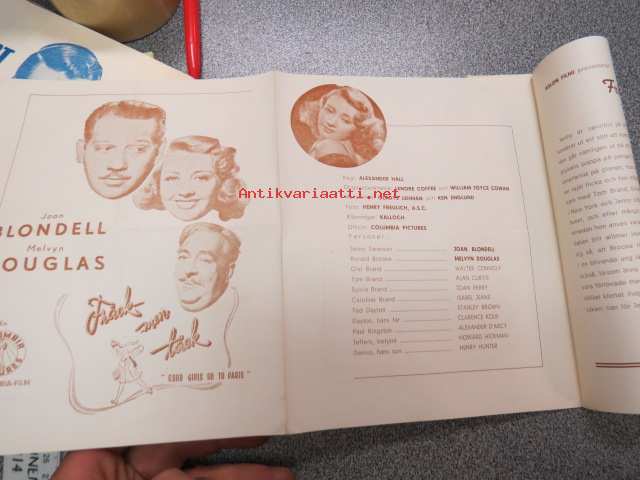 Riuska ja sievä - Fräck men täck, ohjaus Alexander Hall, pääosissa Joan Blondell, Melwyn Douglas, Walter Connoly, Alan Curtis, Joan Perry, Isabel Jeans, Stanley Brown, Clarence Kolb, ym. -elokuvan käsiohjelma