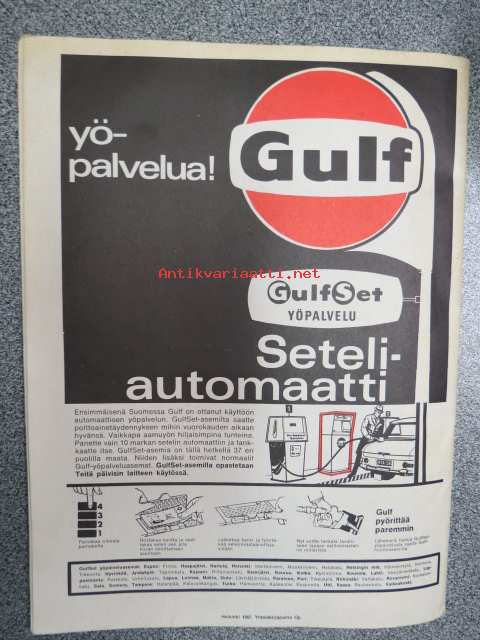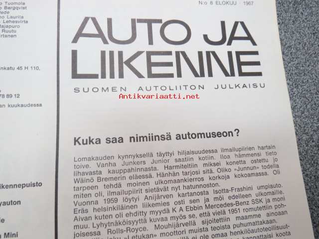 Auto ja Liikenne 1967 nr 8, sis. mm. seur. artikkelit / kuvat / mainokset; Elite farmari 426, Valkeakosken liikennepuisto, Hankimme hyötyauton, Runon ja Rajan tie, Helkama Mini mopedi koeajo, Acadian, Hämeenlinnan moottorirata avattu, Öljynkuljetukset maalla ja merellä osa I, Gulf - GulfSet yöpalvelut & seteliautomaattitankkaus, ym.21 x 28 cm.