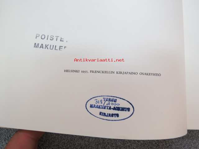 | Saatavilla | 1 kpl | | Julkaisuvuosi | 1956 | | Sivuja | 278 | | Painos | 1. | | Kunto | K2 | | Kirjaston poistoleimat | | Sidonta/painoasu | Nidottu (pehmeäk.) | | Kielet | Suomi |