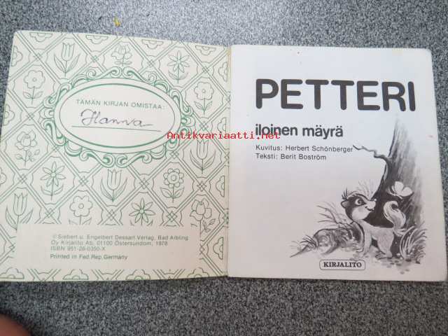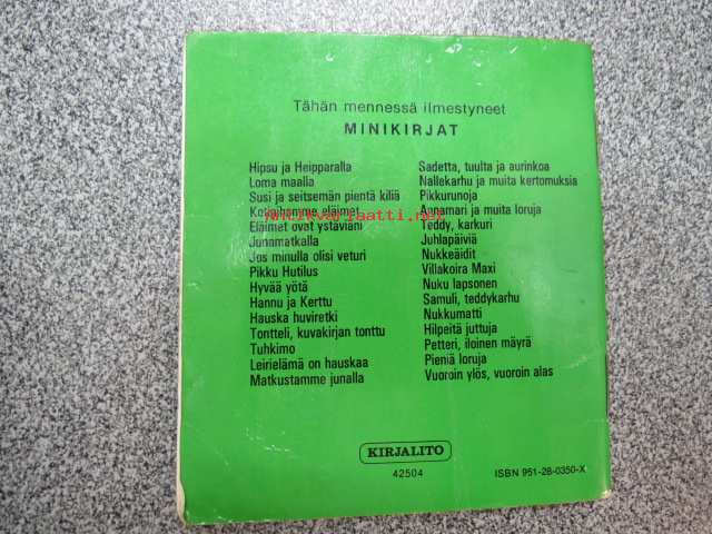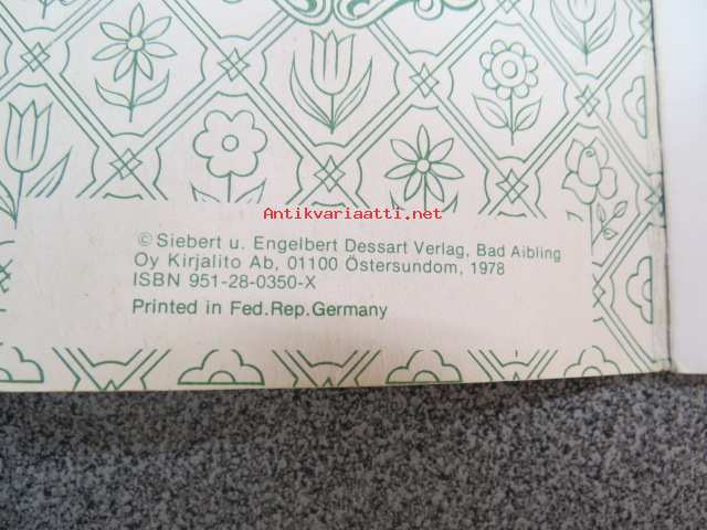 | Saatavilla | 1 kpl | | Julkaisuvuosi | 1978 | | Sivuja | 24 | | Painos | 1. | | Kunto | K2 | | Sidonta/painoasu | Nidottu (pehmeäk.) | | ISBN | 951-28-0350-X | | Kielet | Suomi |