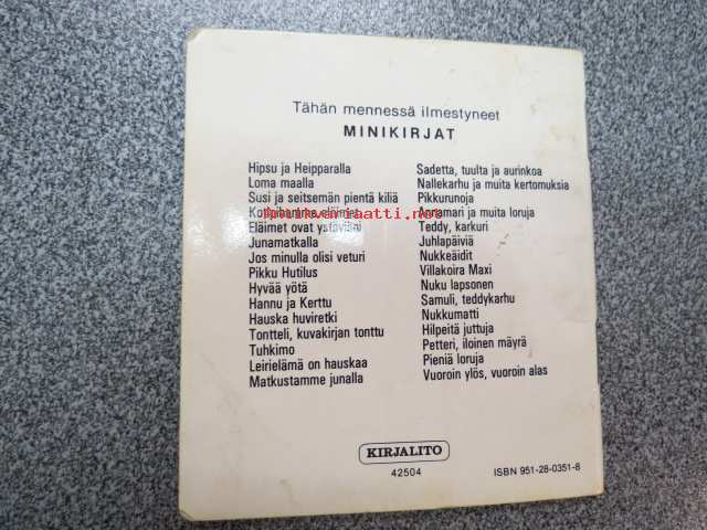 | Saatavilla | 1 kpl | | Julkaisuvuosi | 1979 | | Sivuja | 24 | | Painos | 1. | | Kunto | K2 | | Sidonta/painoasu | Nidottu (pehmeäk.) | | ISBN | 951-28-0351-8 | | Kielet | Suomi |