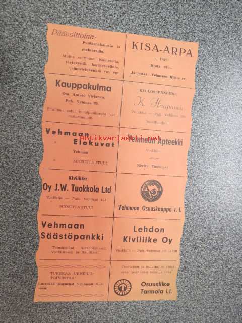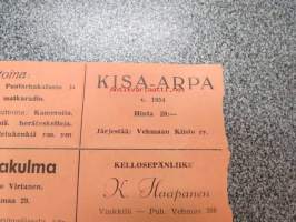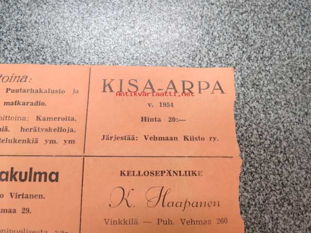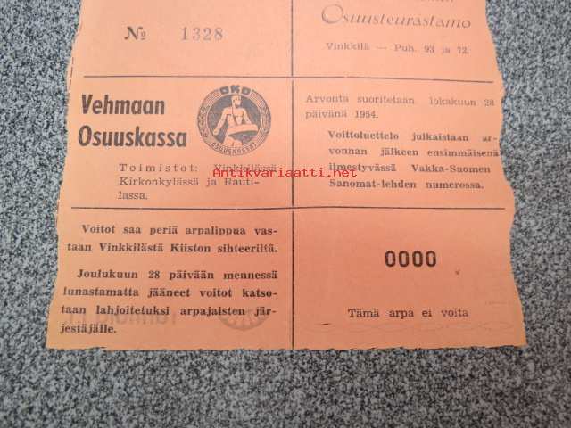 Vehmaan Kiisto Kisa-arpa nr 1328 -arpalippu