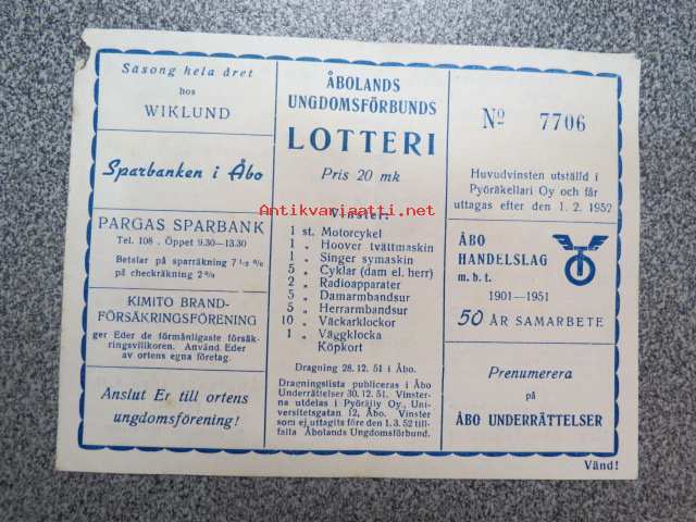 Åbolands Ungdomsförbunds Lotteri 1951 nr 7706 -arpalippu