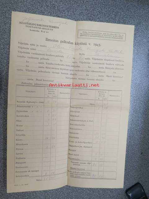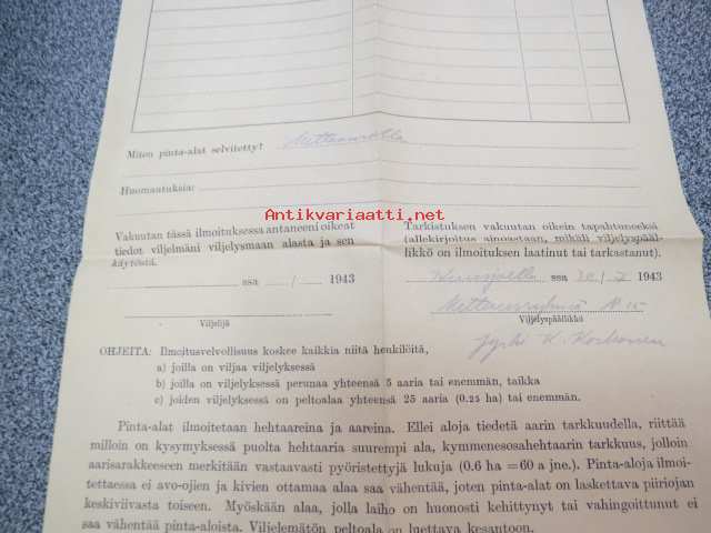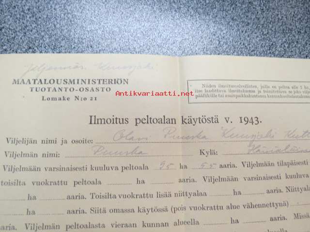 Ilmoitus peltoalan käytöstä v. 1943, Olavi Puuska, Hämäläisen kylä, Kuusjoki, 30.7.1943 -asiakirja