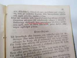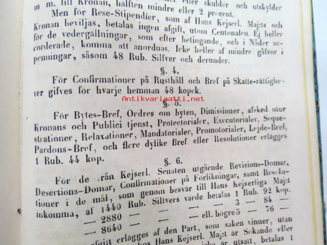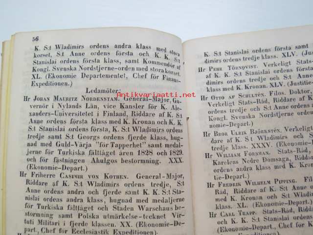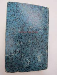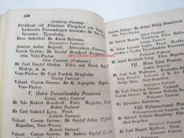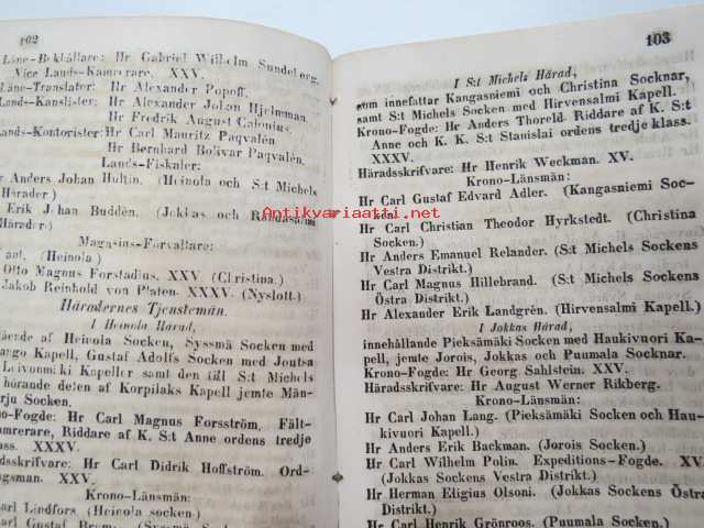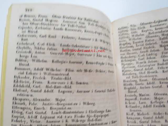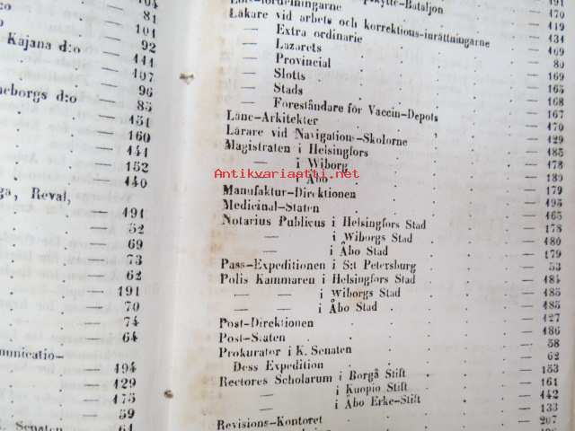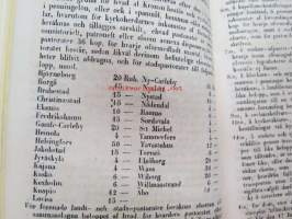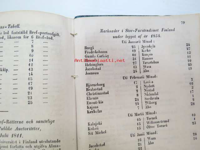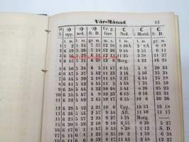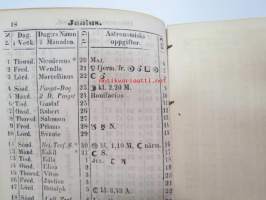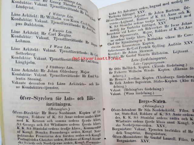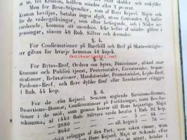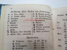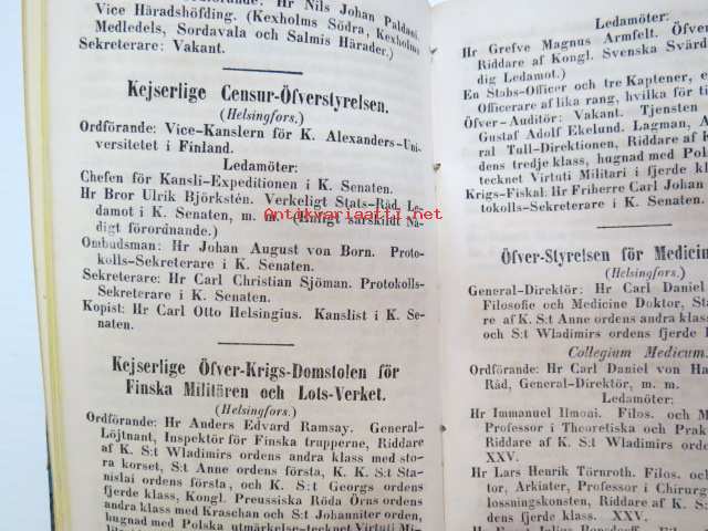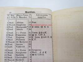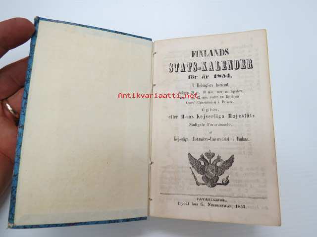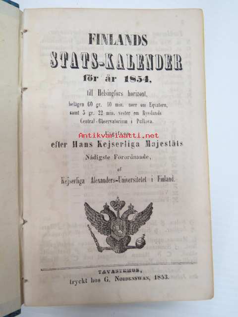 Finlands Stats-Kalender för år 1854, till Helsingfors horizont -valtiokalenteri, jossa mm. almanakka, "Turkarnes Kalender", Dagliga medelvärmen i Helsingfors, Planeternas synbarhet, Ryska Hofvets och Ryska kyrkans högtider, Kort genealogisk uppgift å Utländske Regerande Hus, Kejserliga Senaten för Finland medlemmar, Hofrätts medlemmar... Marknader... pitkät luettelot virkamiehistä eri instanseissa, leimaveromäärät eri asiakirjoihin ym. -kaunis vinjettikuvitus etulehdellä