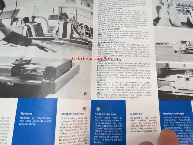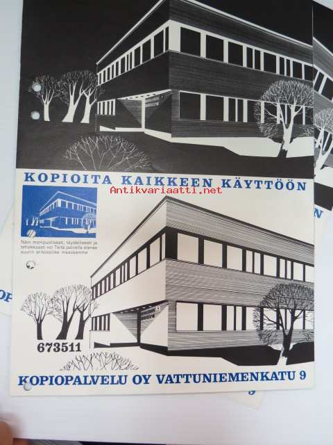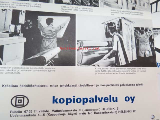 Kopioita kaikkeen käyttöön - Kopiopalvelu Oy (Vattuniemenkatu 9, Helsinki) -esite, hyvä kuvasarja kopiointityöstä ja kalustosta - Mini-pakettiauto APR-75