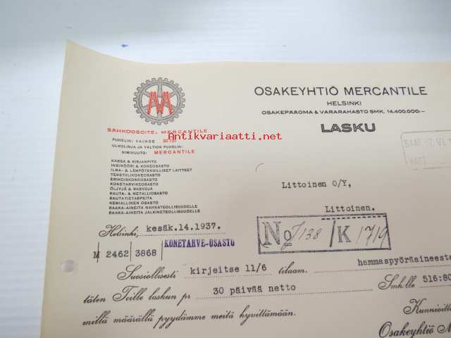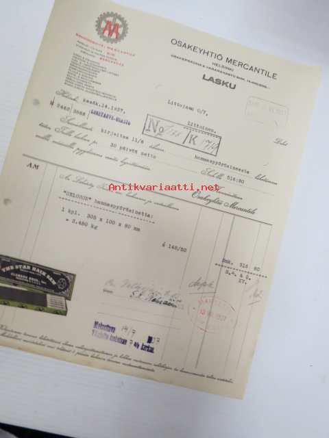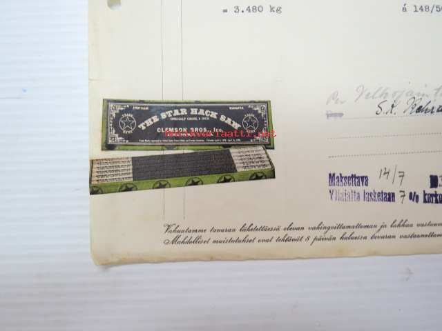 Osakeyhtiö Mercantile, Helsinki 14.6.1937 -liikekirje, huomaa "The Star Hacksaw"-mainoslipukkeet liimattuna