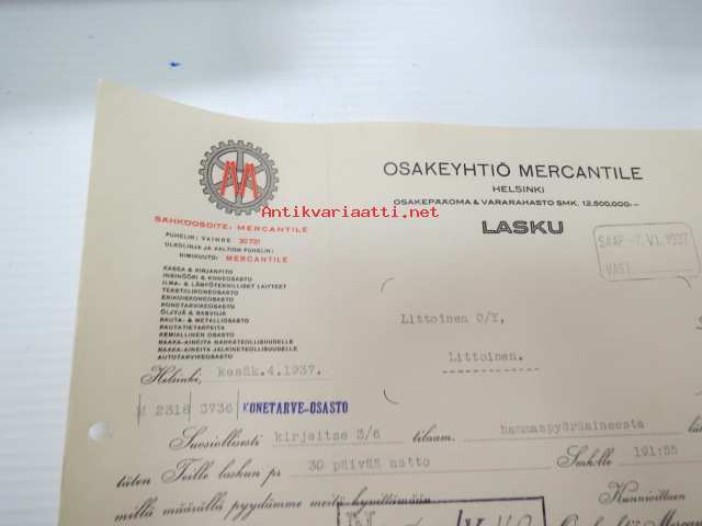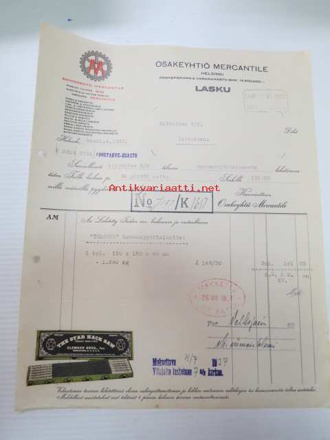 Osakeyhtiö Mercantile, Helsinki 14.6.1937 -liikekirje, huomaa "The Star Hacksaw"-mainoslipukkeet liimattuna