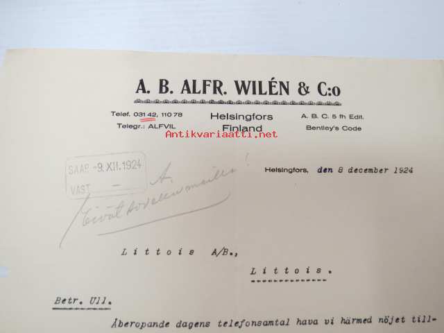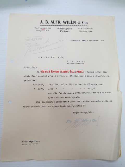 Aktiebolag Alfr. Wilén & Co, Helsingfors, 8.12.1924 -liikekirje