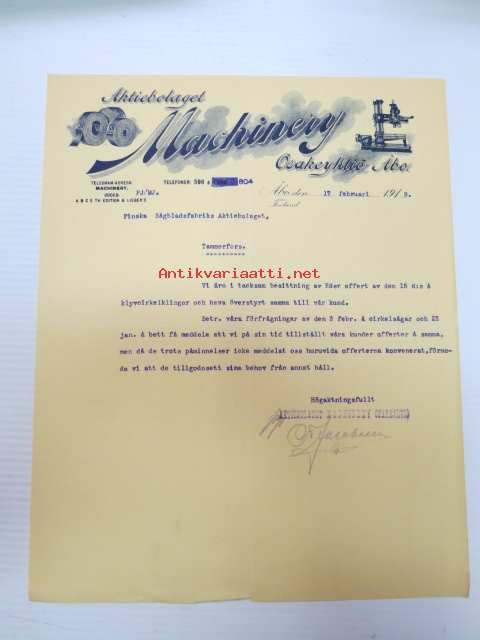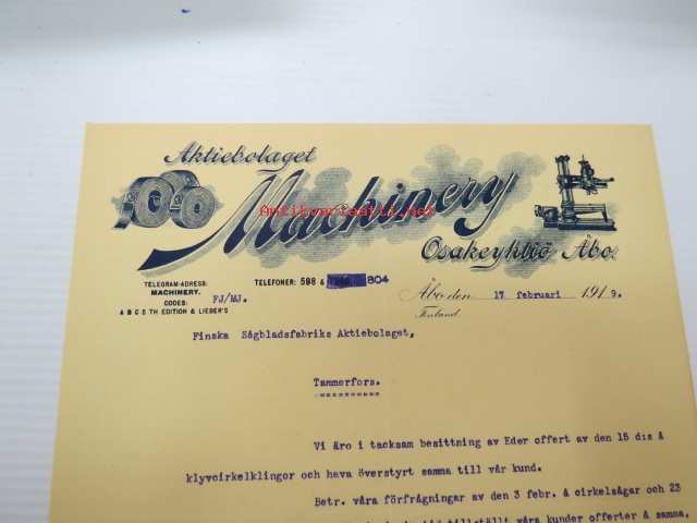 Aktiebolaget Machinery Osakeyhtiö, Åbo, (Turku) 17.2.1919 -liikekirje