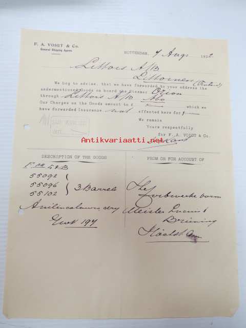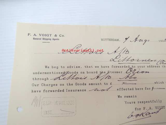 F.A. Voigt & Co - General Shipping Agent, Rotterdam 4.8.1922 -liikekirje