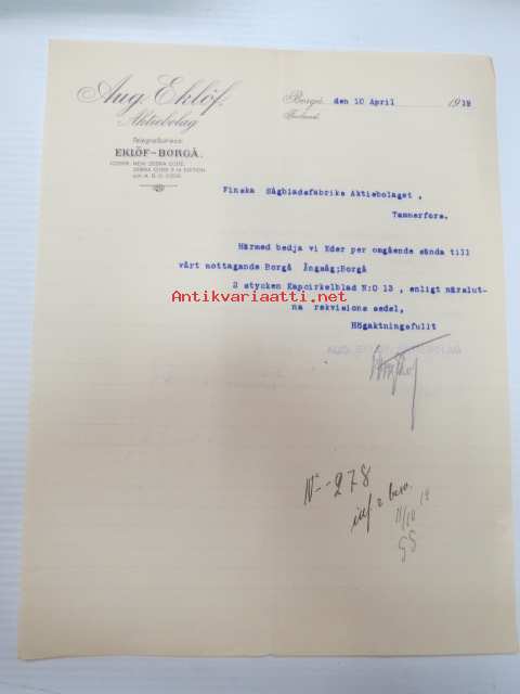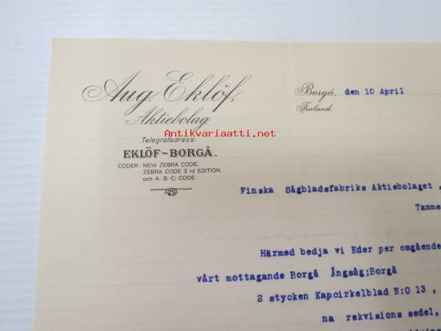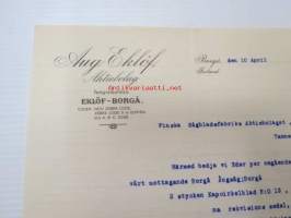 Aug. Eklöf Aktiebolag, Borgå (Porvoo) 10.4.1919 -liikekirje