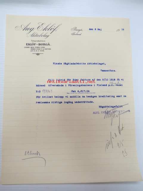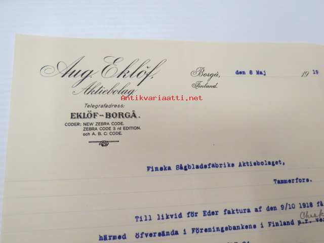 Aug. Eklöf Aktiebolag, Borgå (Porvoo) 8.5.1919 -liikekirje