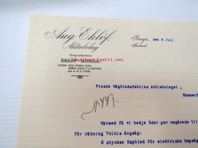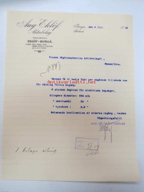 Aug. Eklöf Aktiebolag, Borgå (Porvoo) 4.6.1919 -liikekirje