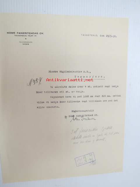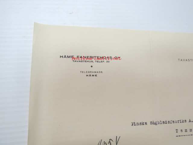 Häme Faneritehdas Oy, Tavastehus (Hämeenlinna) 29.5.1931 -liikekirje