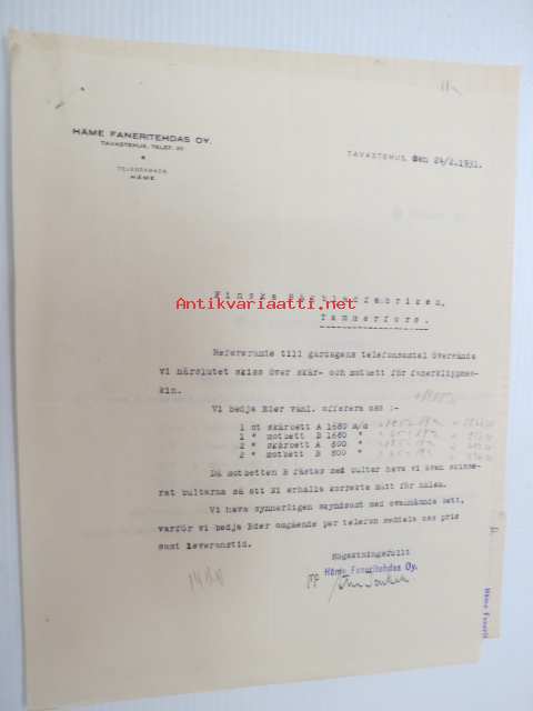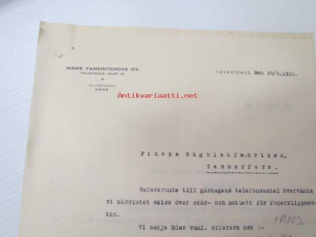Häme Faneritehdas Oy, Tavastehus (Hämeenlinna) 24.2.1931 -liikekirje
