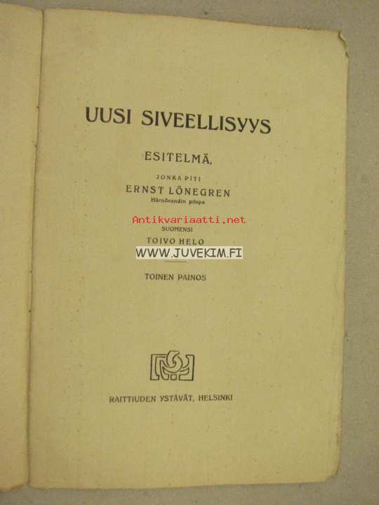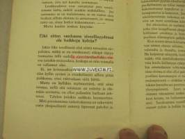 | Saatavilla | 1 kpl | | Julkaisuvuosi | 1917 | | Sivuja | 22 | | Painos | 2. | | Kunto | K2 | | Sidonta/painoasu | Nidottu (pehmeäk.) | | Kielet | Suomi |