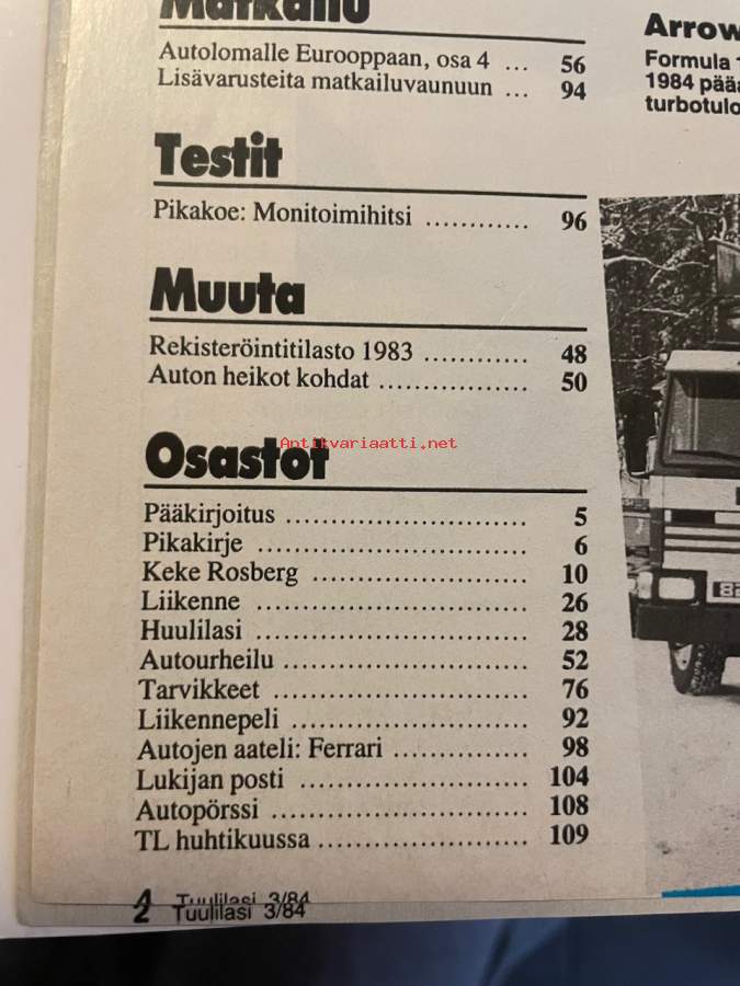 Tuulilasi 1984 nr 3 Saab 96:n huolto, Talbot Horizon Diesel, kestotesti väliraportti Mazda 626, Toyota Corolla ja Peugeot 205 Mitsubishi Space Wagon & Nissan Prairie