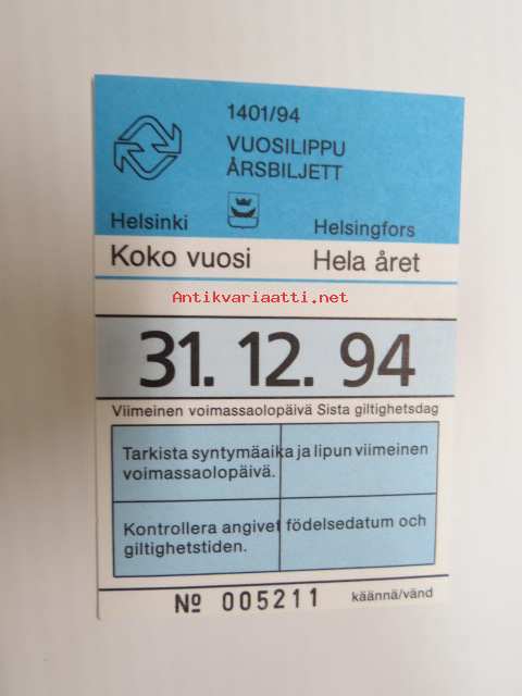 Helsinki / Liikennelaitos / HKL - HST / YTV - 1994 Vuosilippu nr 005211 -matkalippu