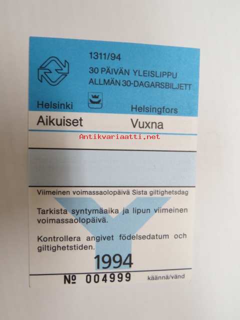 Helsinki / Liikennelaitos / HKL - HST / YTV - 1994 30 päivän yleislippu Aikuiset nr 004999 -matkalippu