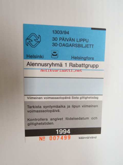 Helsinki / Liikennelaitos / HKL - HST / YTV - 1994 30 päivän lippu Alennusryhmä 1 nr 007499 -matkalippu