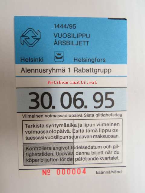 Helsinki / Liikennelaitos / HKL - HST / YTV - 1995 Vuosilippu Alennusryhmä 1 nr 000004 -matkalippu