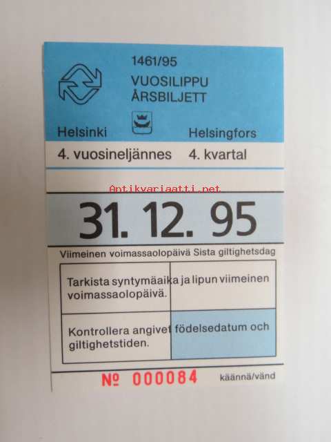 Helsinki / Liikennelaitos / HKL - HST / YTV - 1995 Vuosilippu 4. vuosineljännes nr 000084 -matkalippu